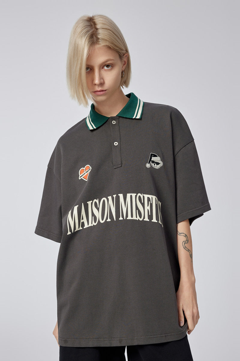 Featuring MAISON MISFIT branding across the front, along with creative logo accents, this polo makes a statement while maintaining a sleek, versatile look. The detailed collar design adds an extra touch of refinement, making it ideal for casual wear, nights out, or smart-casual occasions.